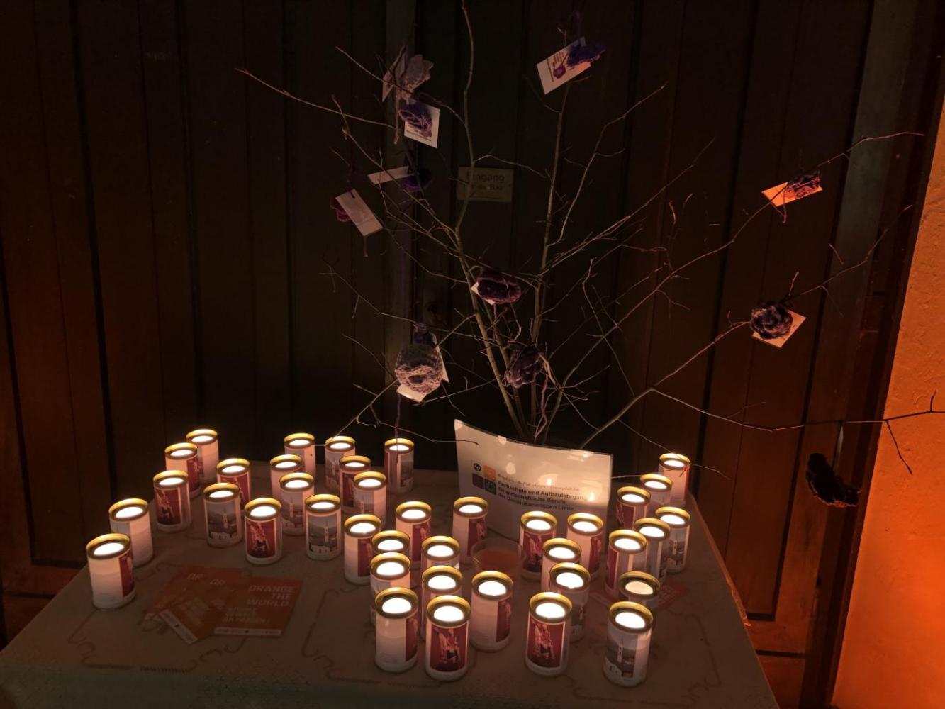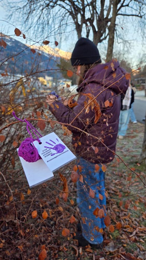 Am Mittwoch, dem 10.12.2025, fand abends im Rahmen dieser Initiative eine Andacht vor dem Franziskanerkloster statt. Die Schüler:innen der EWF brachten dafür am Vormittag eine Vase mit Sträuchern hin, die mit den violetten Rosen geschmückt waren. Die 1FW platzierte diese sichtbaren Zeichen am Iselkai auf Sträuchern und Sitzgelegenheiten.